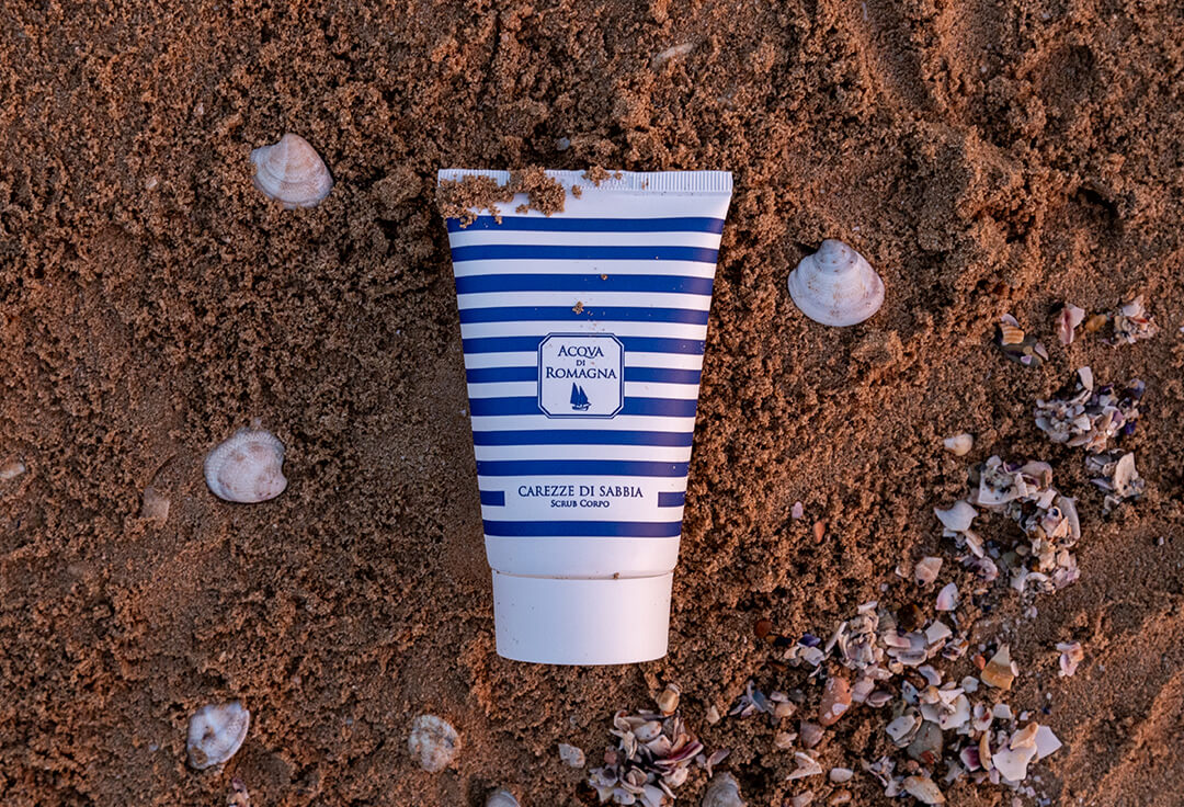 Carezze di Sabbia è uno scrub cremoso con microgranuli vegetali, burro di karité e vitamina E. Esfolia e nutre la pelle, lasciandola luminosa e vellutata, rievocando la sensazione della sabbia sulla pelle durante le vacanze estive in Romagna.